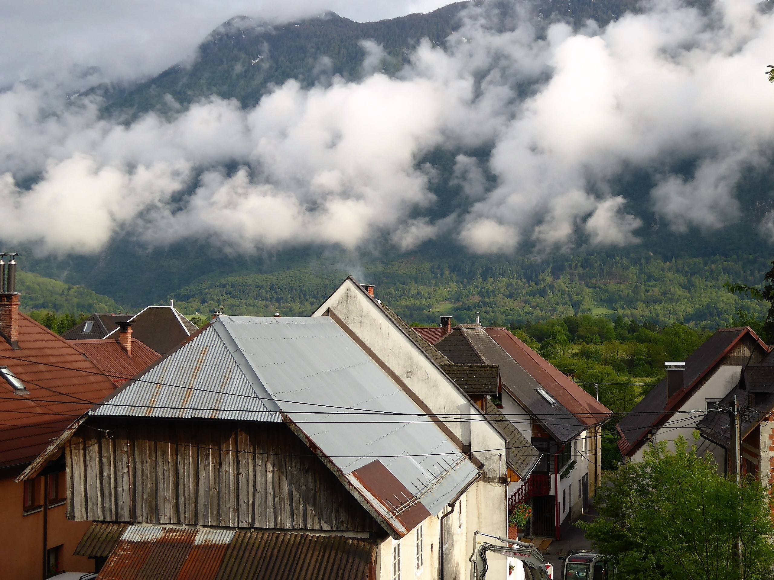 A dramatic change in our accommodation. In Bovec we were in a new, modern apartment, quite large – here we are in a small apartment in a renovated communist era hotel. Our front window looks out on. the square – a statue, an old town hall, a church steeple, and tonight , low-lying clouds moving across the forests on the mountain side and in places, catching in the tops of the trees, like fairly floss.