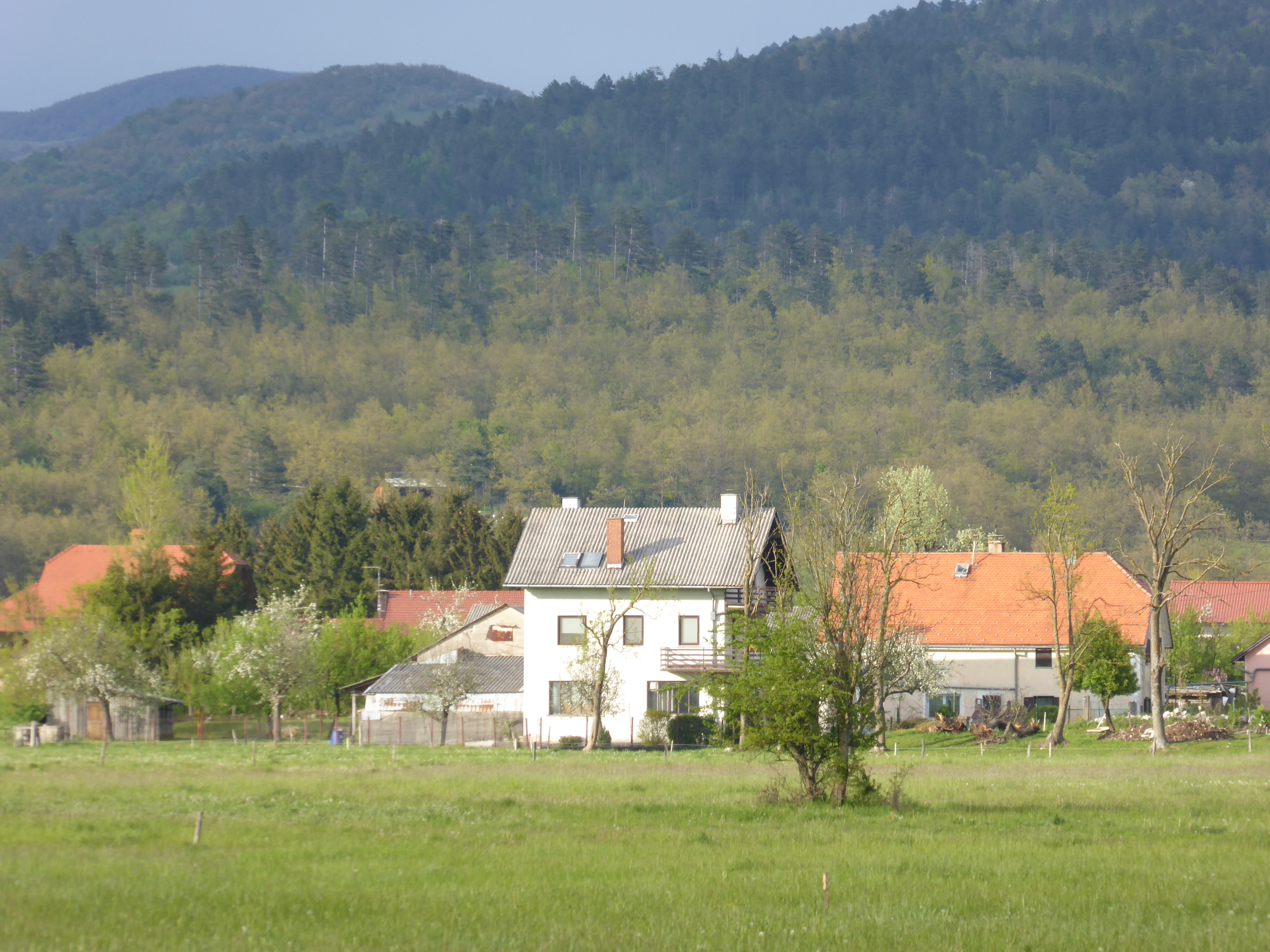 To get there, we had to walk. It was about 3 kilometres. One way was to walk into Pivka and out to Trnje following the roads. Another way was to cut across the rural area, following dirt roads over low grassy hills. We chose the second option – and got lost. It was sunny and warm. Finally, we got there, worse for wear. The man who ran the hotel, along with his wife, was out working in his garden, when he saw two people with big rucksacks making their way towards him through a field of high grass. It was definitely a one-off he said. Normally people arrived in a car. We stayed there for a few days. The walking was excellent. The terrain is hilly rather than mountainous in this area although there are some high ridges in between. On one of them, visible from the hotel, was a church – we walked up there one day and got caught in a storm – with lots of thunder and lightning. We had to huddle next to the church (it was closed) until the lightning subsided.
