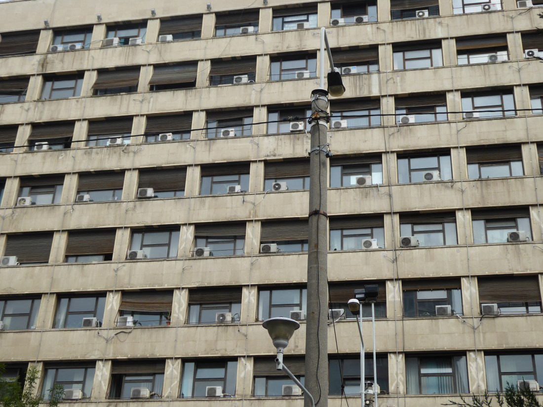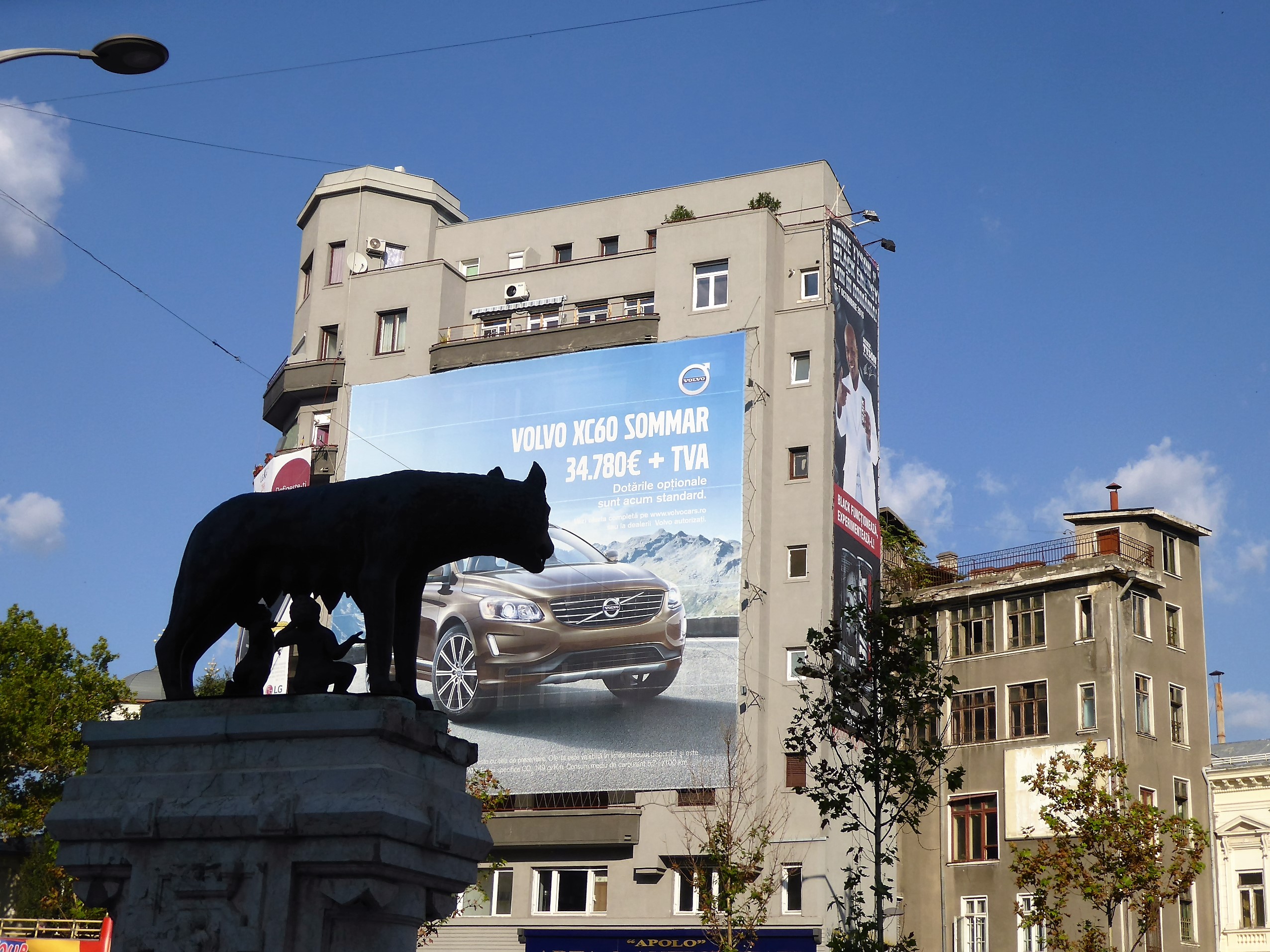 Bucharest, like Rome, claims its origins in the myth of the she wolf and her human infants ….but its future embraces another, more powerful myth, that of the middle class consumer life. An advertisement for an SUV parodies the communist era buildings it’s attached to….and announces ‘here I am, the new God’
