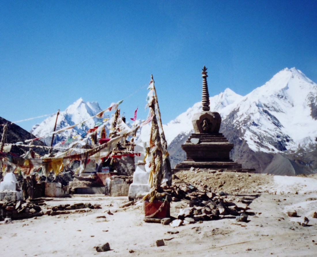 The trail went where it could, seeking the traversable areas of the landscape. It exploited the possibilities. Its existence began when human beings, driven by sheer necessity and possessing a profound knowledge of the landscape, worked out where it was possible to walk and climb to reach a given point somewhere in mountains: a village, a town, a monastery, a sacred lake – the plains of Northern India or the inner regions of Tibet. The Himalayan trail represented the triumph of human beings over the fierce adversity of Nature. And finding the trail was a serious business: to lose the trail in that wild, merciless landscape was to confront the certainty of death. When human beings followed a Himalayan trail, they did so with prayers and mantras on their lips. They beseeched their gods to keep them safe, surrounded as they were by the sheer overwhelming power of the natural world. At the tops of the passes there were shrines – a trident spear, a prayer wall, an image of Shiva or Budda – where one stopped and paid one’s obeisance to the supernatural being beyond the cycle of life and death.