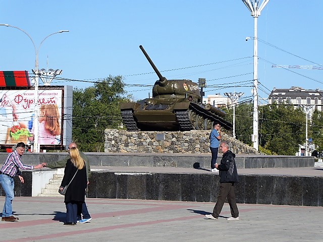 Russian tank from the Second World War and Russian tourists, still dreaming of the past, when Russia had some kind of claim to greatness after defeating the Nazis.