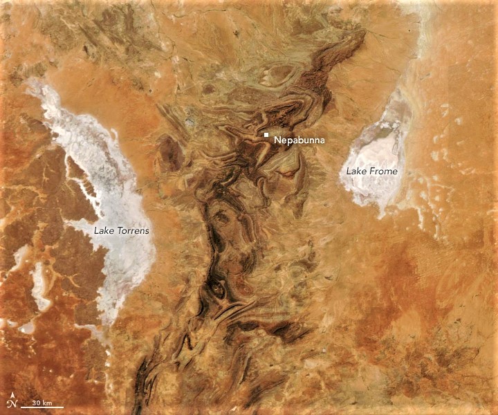 The Flinders Ranges runs into the heart of Central Australia, the greatest arid area in the world. Photographed here from a NASA satellite, we see that the Flinders Ranges is surrounded by desert and huge salt lakes, two of which are shown here (but there are in fact 5 of them including further north, the vast Lake Eyre – 9.5 000 sq kms – not shown in this frame).