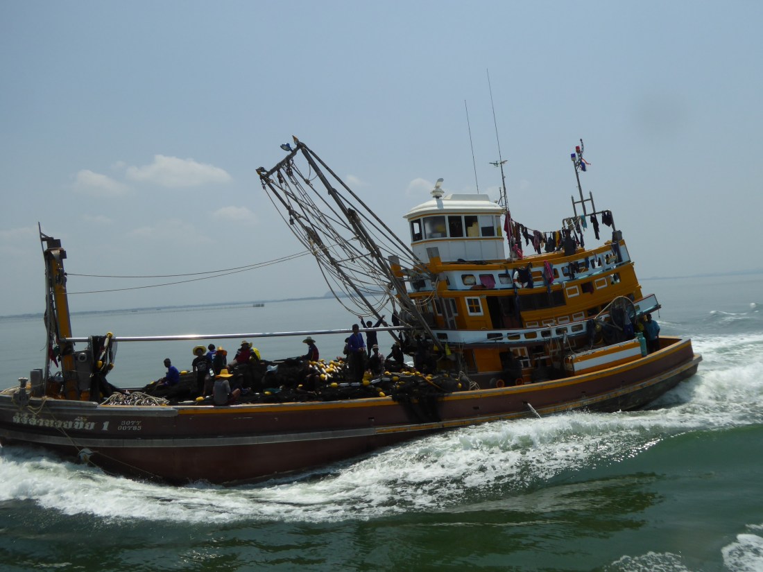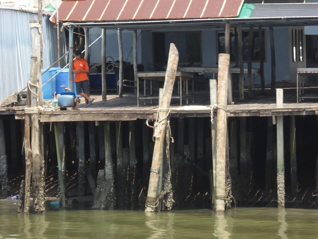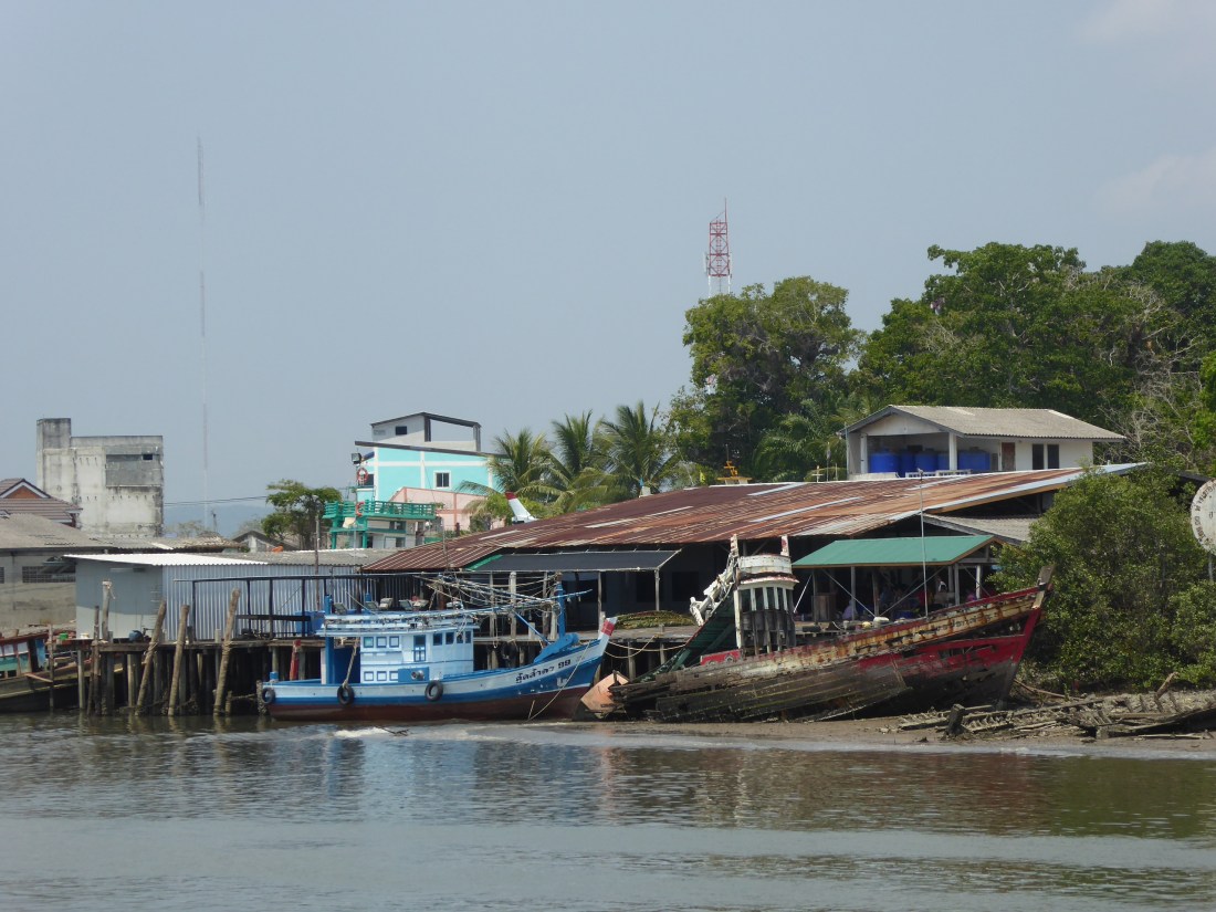 In November, 2016, on a trip by ferry boat along a river in the Krabi, Southern Thailand, I came to a fishing boat harbour near the mouth of the river, where it met the open sea. I was one of the few passengers standing outside, near the clattering motor. Everyone else was downstairs, in the comfortable seats, listening to music on their phones or watching the movie on the big screen.