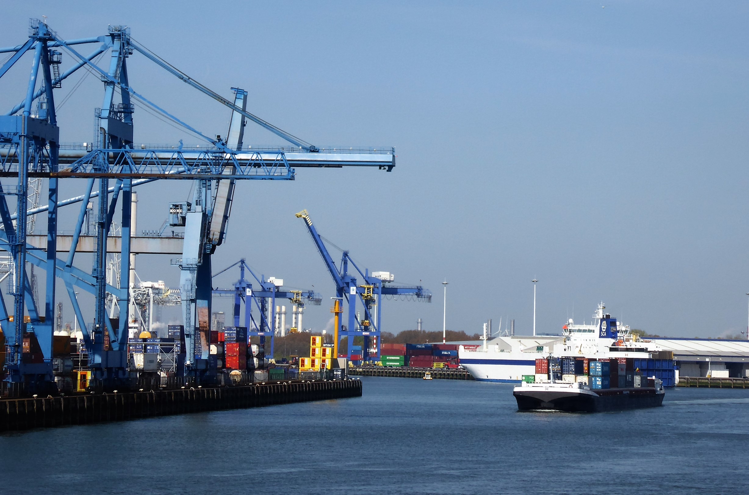 In The Netherlands there’s a saying which goes: ‘the money is earned in Rotterdam and spent in Amsterdam’. There’s more than a grain of truth in this. Rotterdam is the biggest harbour in Europe and the second biggest in the world (after Shanghai). It is the most technologically advanced harbour in the world – a vast network of container terminals on the banks of a long estuary. The business of Rotterdam, its reason for being: to load and off load the containers from super tankers as quickly as possible. From there, the containers are transported by railway, barge and truck to Germany and Eastern Europe. Back from the container terminals are endless kilometres of warehouses, chemical factories, oil refineries – and ship repair yards.