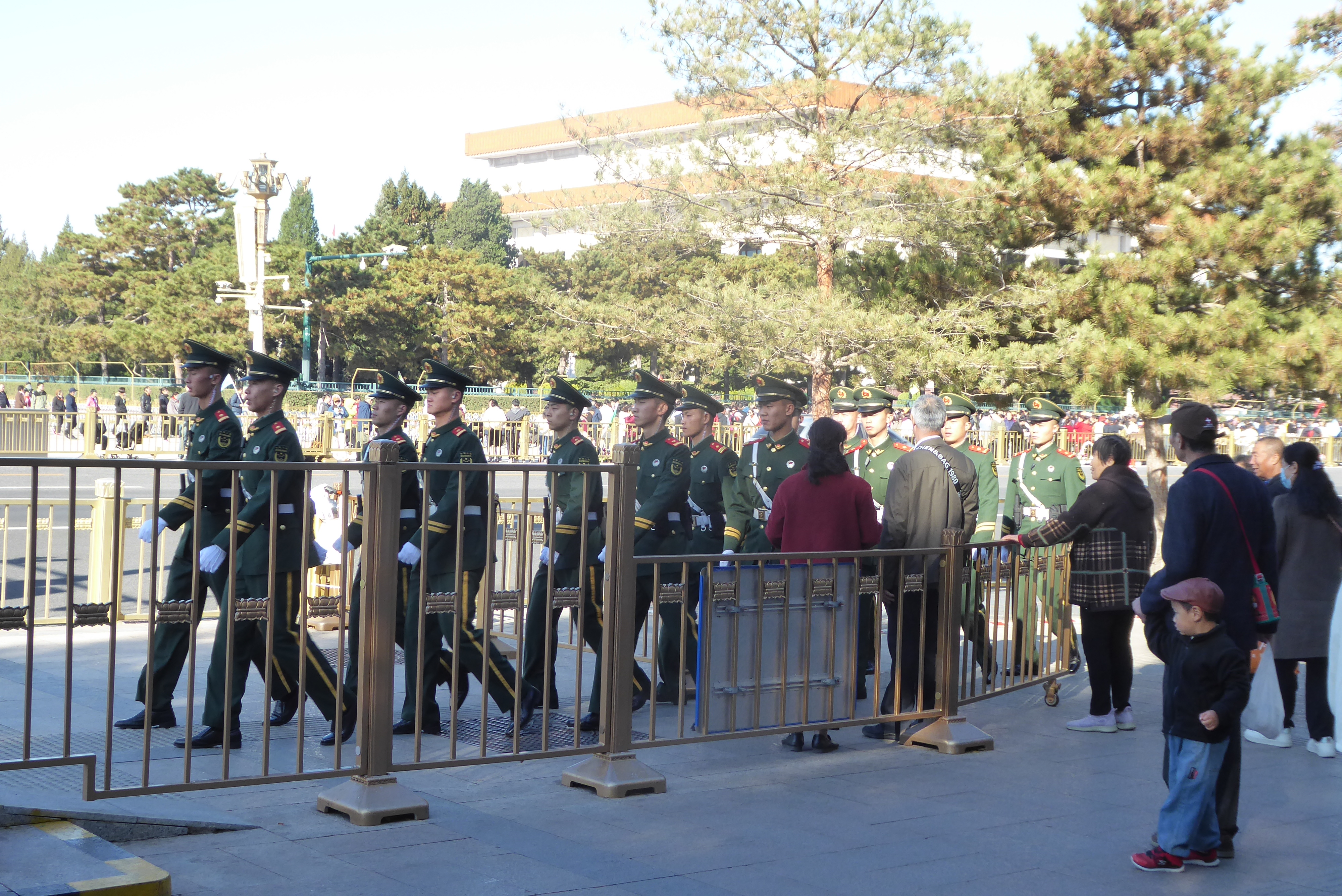 We had to go through two checkpoints where we body searched and later, a third one and in the meantime had to show our passports maybe 7 or 8 times. There was an obsession with ‘security’ or better said control. In the following days we noticed the police stopping motorists to check their ID cars. Emerging from a Gestapo like search and control session, we were greeted by the sight of goose stepping military guards. For Chinese people this is normal, a part of a safe and orderly society. If there is one word which incites apprehension amongst them it is ‘chaos’.