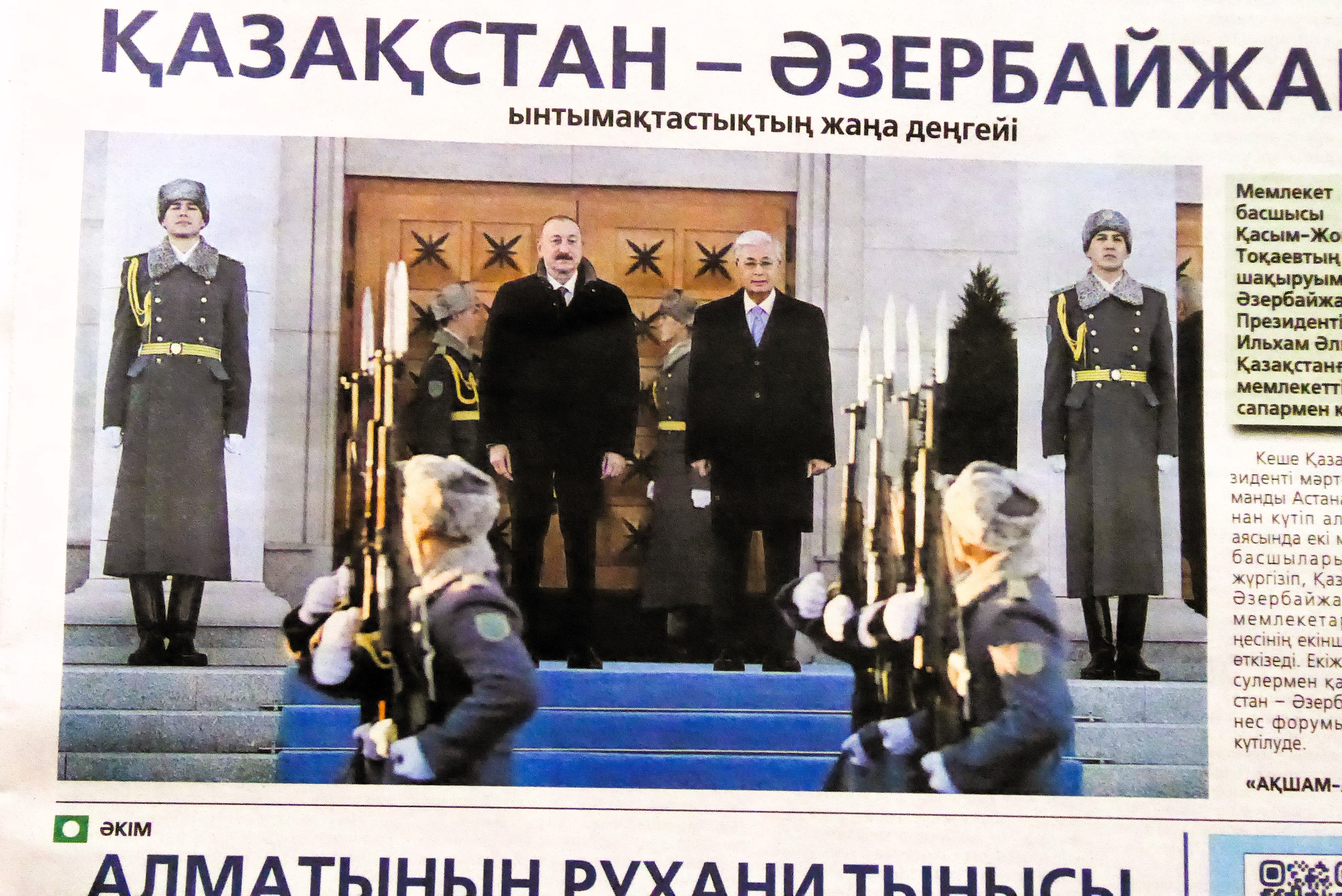 A clipping from a local newsaper featuring the President and vice President of Kazakstan – and very much a Russified scene….