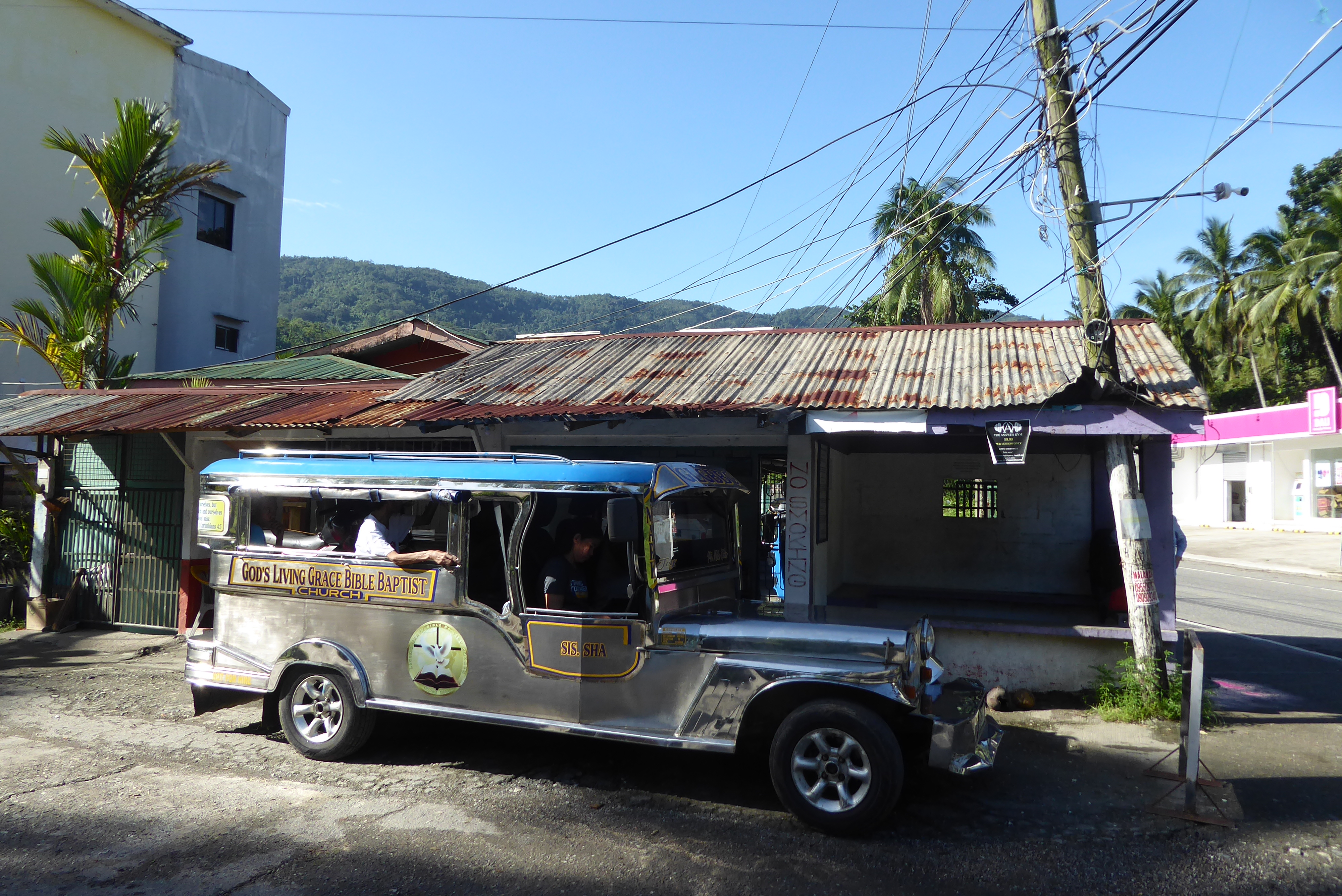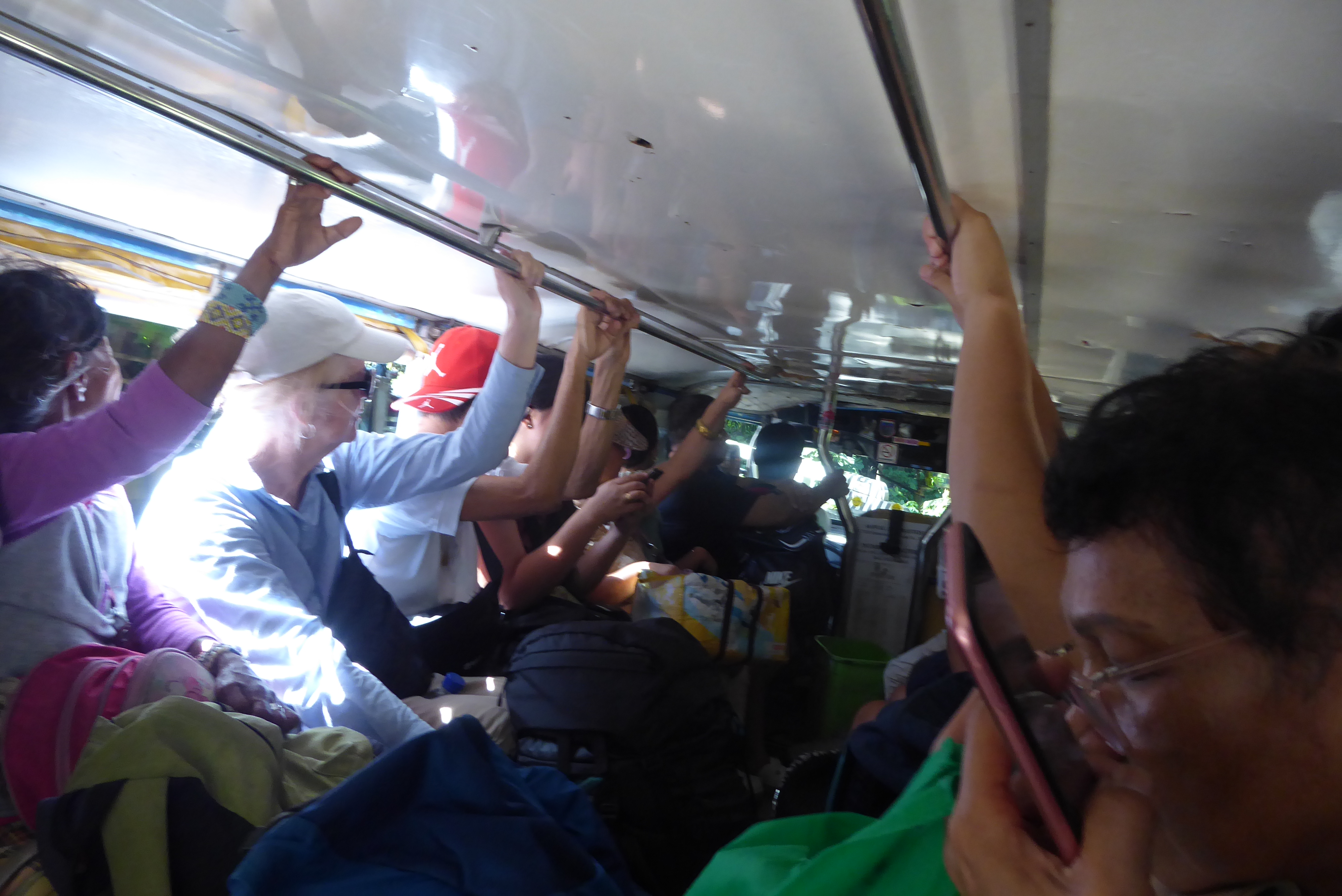 A common form of transport for the many people who cannot afford a car: the Jeepney. Something between a bus and truck, open at the back with two long bench seats either side. As we discovered to our surprise, it doesn’t matter if you want to get into a crowded jeepney with rucksacks – people will always make room for you.